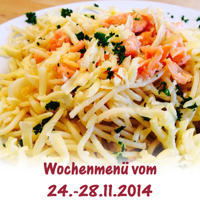 Diese Woche halten wir für Sie zum Mittagessen / Mittagstisch folgendes bereit: Montag: Weißkrauteintopf mit Hackfleisch und Brot für 3,90€ Bunte Nudeln mit Rauchlachsstreifen in Kräutersoße, Käse für 4,90€ Dienstag: Sahnige Käsespätzle mit Röstzwiebeln und Salatbeilage für 4,40€ Gänsekeule mit Rotkraut und Klöße für 6,30€ Mittwoch: Gulasch mit Knödelscheiben und Speckbohnen für 4,90€ Fischstäbchen mit […]